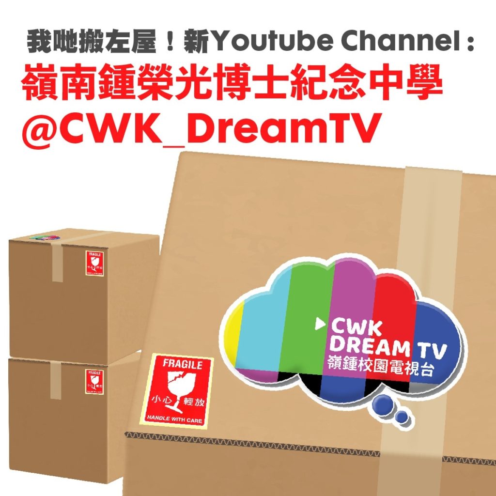 大家請留意:嶺鍾中新的校園電視台CWK Dream TV已正式面世,大家可以在學校網站見到我們,又或者去YouTube Channel 搜尋我們-嶺南鍾榮光博士紀念中學@CWK_DreamTV,我們會經常把學校活動短片擺放上去,或者你可以見到自己呀!
